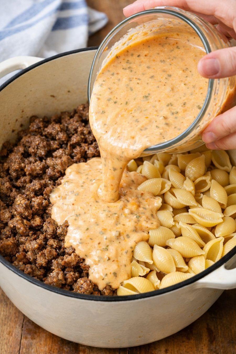 What makes this dish so special is the way it transforms basic pantry ingredients into something that tastes far more thoughtful and layered than the process suggests. The rich beef, the tender pasta shells, and the creamy tomato-based sauce all come together in a single pot, creating a meal that feels hearty and complete without the stress of multiple steps or complicated cleanup. It’s the kind of food that fills the kitchen with warmth and the table with silence—because everyone is too busy enjoying every bite. There’s something incredibly satisfying about a recipe that delivers so much comfort with so little effort, and this one does exactly that every single time.